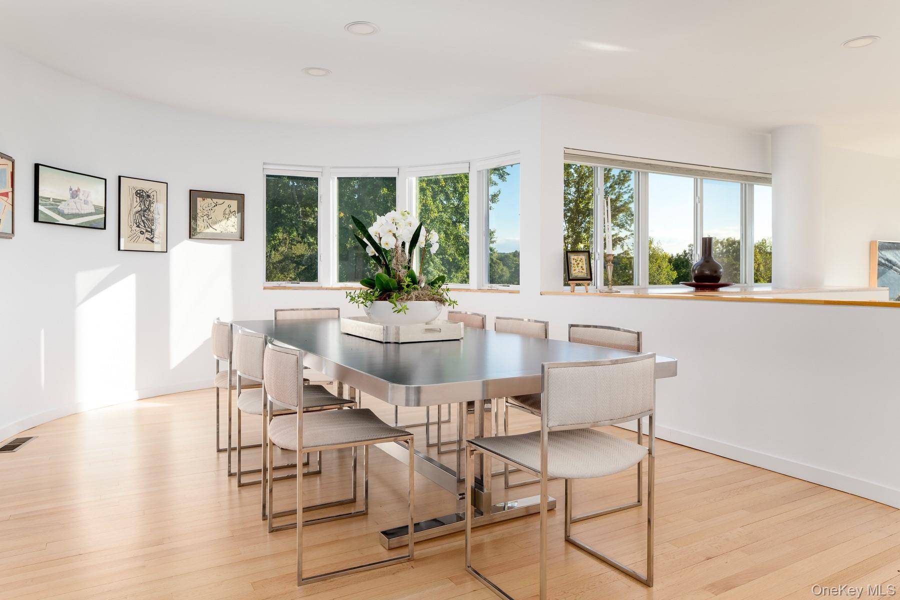 An open flow from the front door through the long entry hall/gallery, with high ceilings and skylights, presents water views thru the living room and dining area. The living room has high ceilings, a fireplace and French doors with a terrace showcasing the amazing waterfront setting. Skylights and floor to ceiling glass doors enhance the light throughout the house.